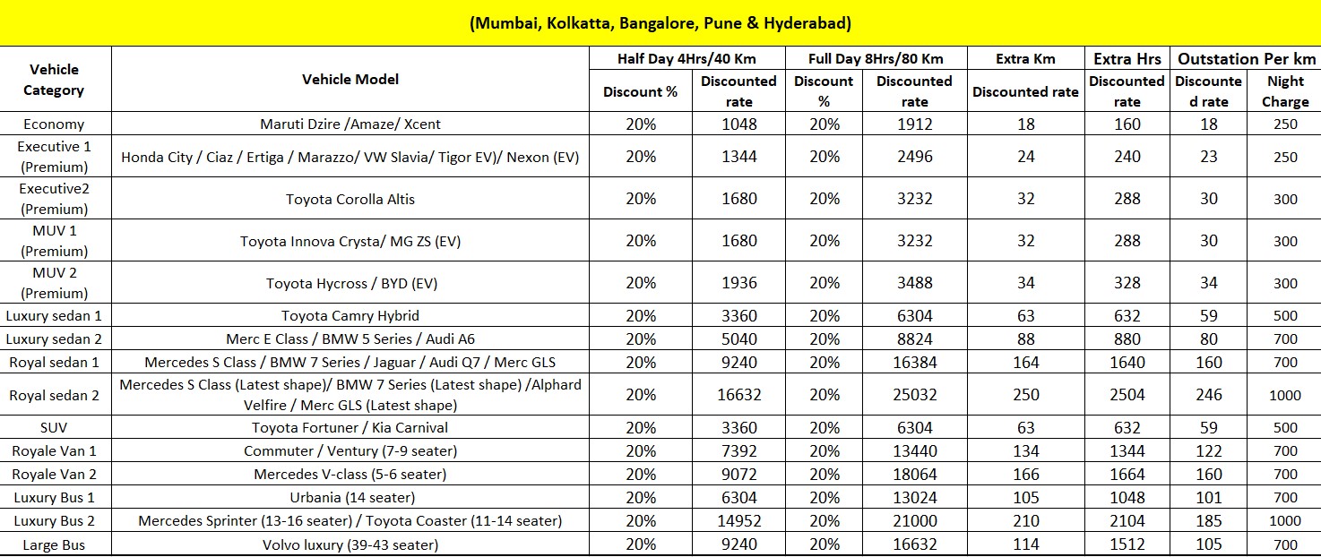 Vehicle Segment Special discounted rate in Delhi / Mumbai / Bangalore Discounted rates in all cities across India Discount % 8hr / 80Kms Extra Hour Rate Extra Kms Rate Discount % 8hr / 80Kms Extra Hour Rate Extra Kms Rate Toyota Innova Crysta N/A N/A N/A N/A 30% ₹ 2,240.00 ₹ 224.00 ₹ 22.40 Altis N/A N/A N/A N/A 30% ₹ 2,660.00 ₹ 266.00 ₹ 26.60 Toyota Camry N/A N/A N/A N/A 30% ₹ 5,180.00 ₹ 518.00 ₹ 51.80 Toyota Fortuner N/A N/A N/A N/A 30% ₹ 5,530.00 ₹ 553.00 ₹ 55.30 Mercedes E Class / Audi A6 / BMW 5 Series N/A N/A N/A N/A 30% ₹ 6,930.00 ₹ 693.00 ₹ 69.30 Mercedes V Class (5 Pax) / Mercedes Sprinter (16 Pax) N/A N/A N/A N/A 30% ₹ 11,200.00 ₹ 11,20.00 ₹ 112.00 Mercedes S Class / BMW 7 Series / Jaguar / Audi Q7 40% ₹ 10,800.00 ₹ 1,080.00 ₹ 108.00 30% ₹ 12,600.00 ₹ 1,260.00 ₹ 126.00 Toyota Commuter (8 pax VIP Mini Van) 50% ₹ 8,000.00 ₹ 8,00.00 ₹ 8,0.00 30% ₹ 11,200.00 ₹ 11,20.00 ₹ 112.00 Chrysler Limousine (Delhi/NCR - Only) 50% ₹ 30,000.00 ₹ 30,00.00 ₹ 300.00 N/A N/A N/A N/A
